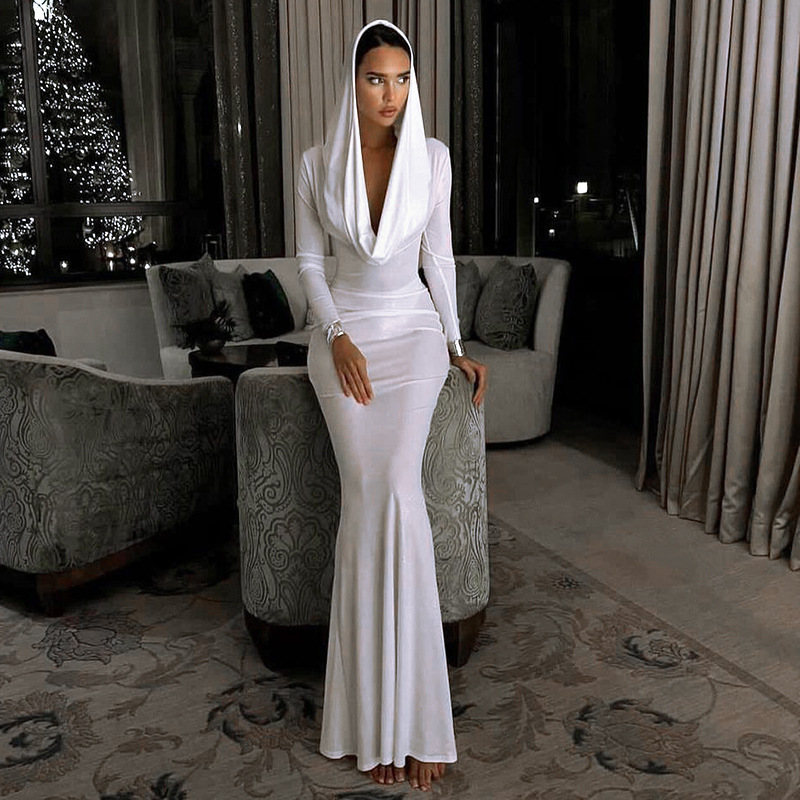Cross Border Trendy Unique White Hooded Swing Collar High Waist Slim Fit Long Dress
